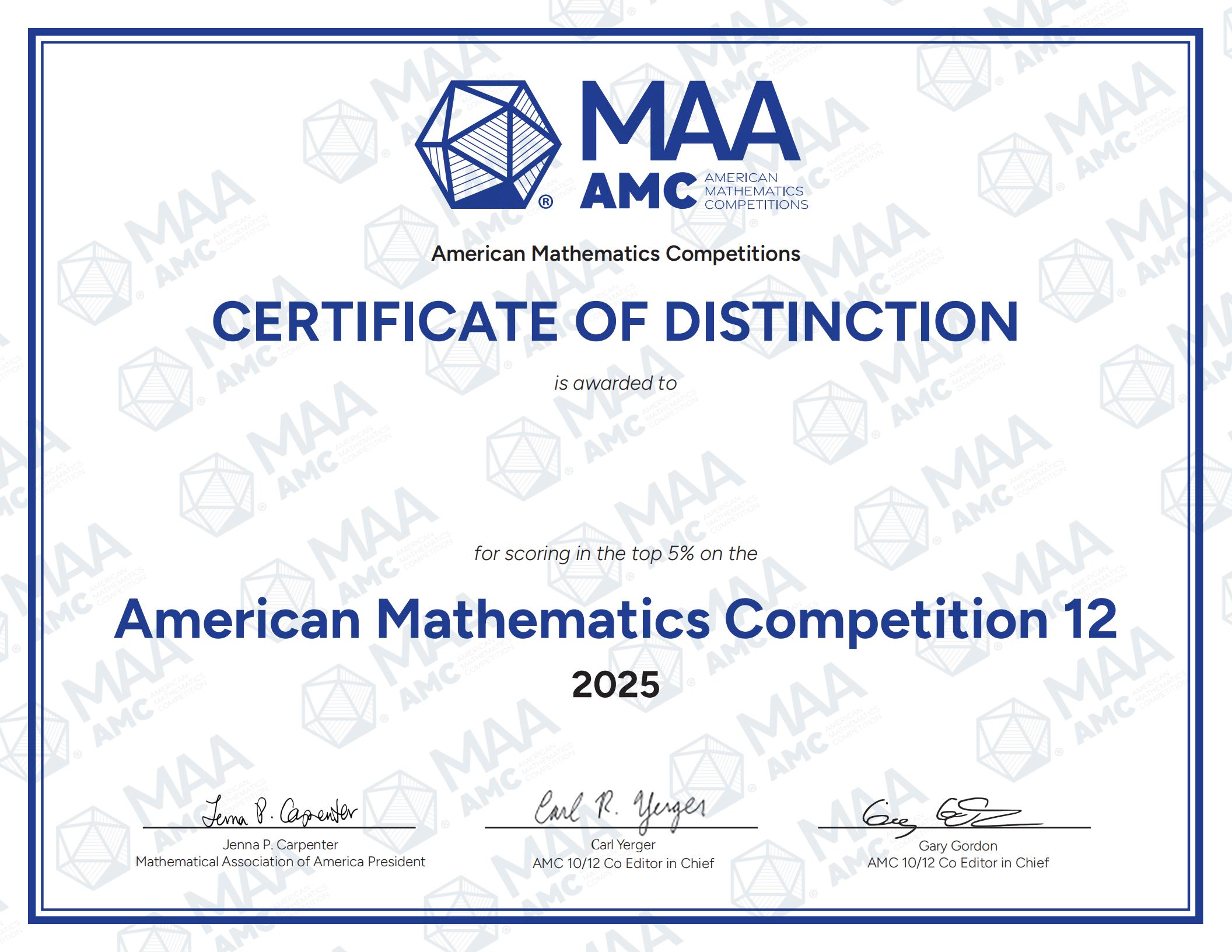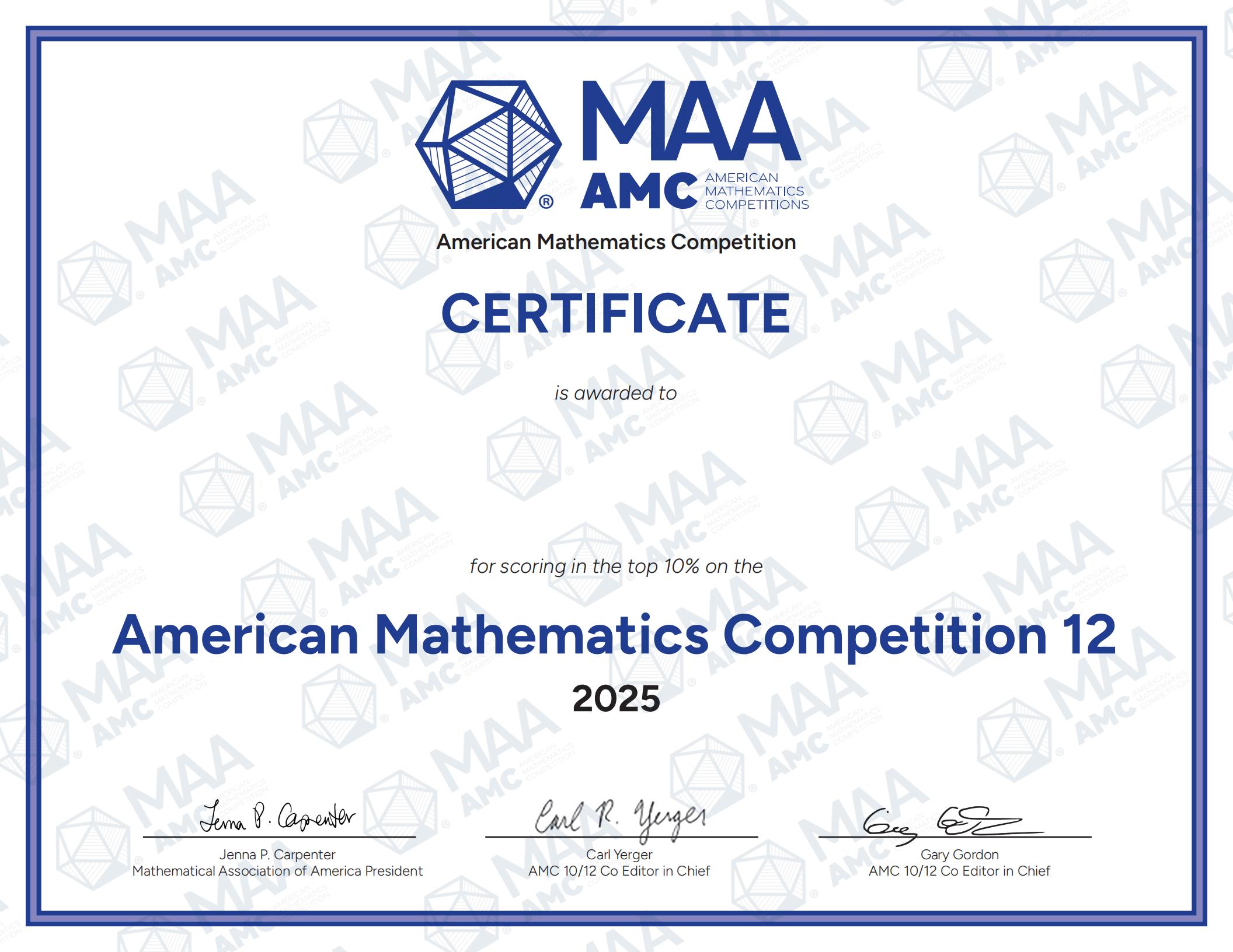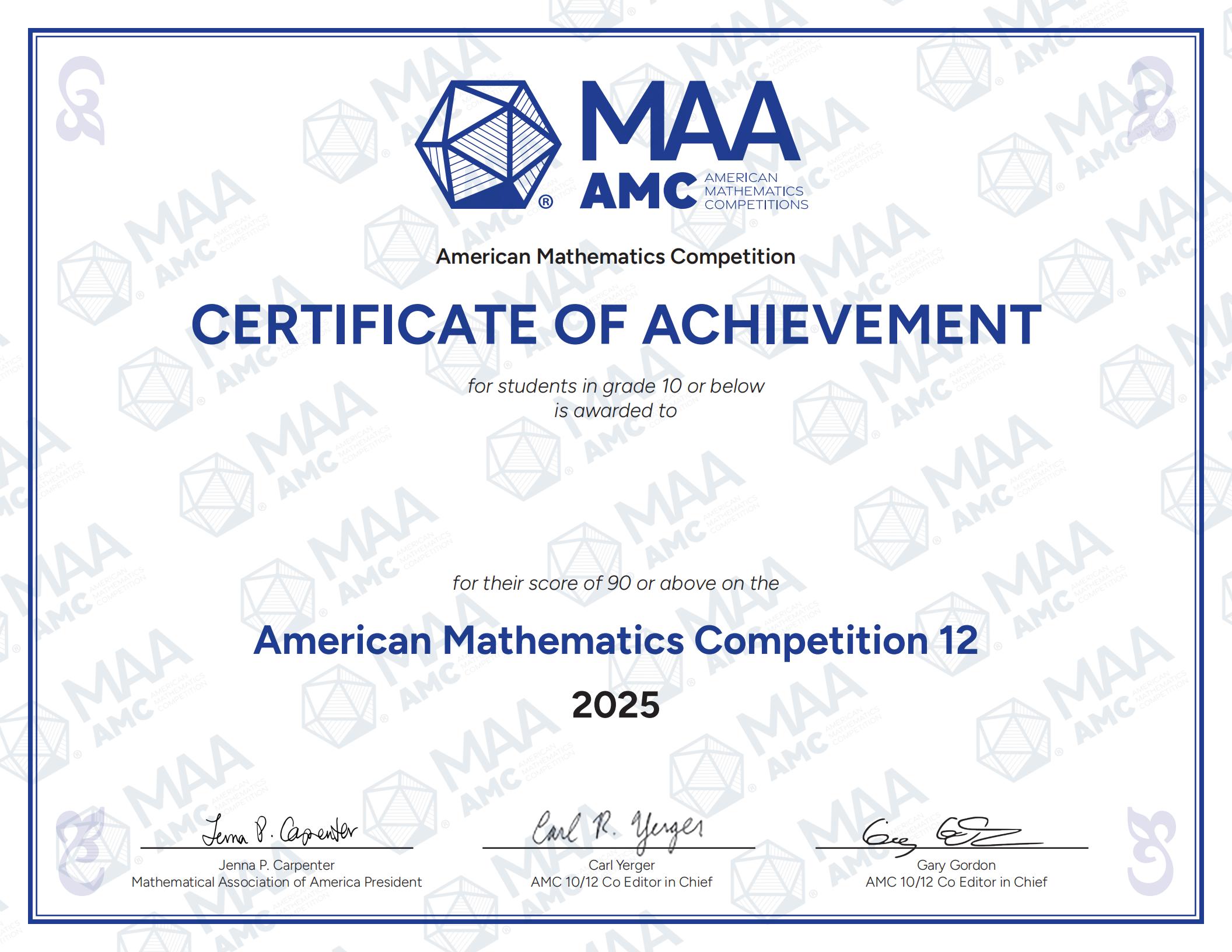 | Range | AMC 8 covers from a middle school mathematics curriculum. Possible topics include but are not limited to: counting and probability, estimation, proportional reasoning, elementary geometry including the Pythagorean Theorem, spatial visualization, everyday applications, and reading and interpreting graphs and tables. Some of the later questions may involve linear or quadratic functions and equations, coordinate geometry, and other topics traditionally covered in a beginning algebra course. | Usually covers mathematics syllabus in Grade 9 and Grade 10, including elementary algebra, basic geometry (Pythagorean theorem, area and volume formulas, etc.), elementary number theory and probability. Trigonometry, advanced algebra and advanced geometry will not be included. | AMC12 covers all mathematics knowledge learned in high school, including trigonometry, advanced algebra, advanced algebra and part of calculus. | Students who get great results in AMC 10/12 will be invited to participate in AIME. More difficult than AMC 10/12. |