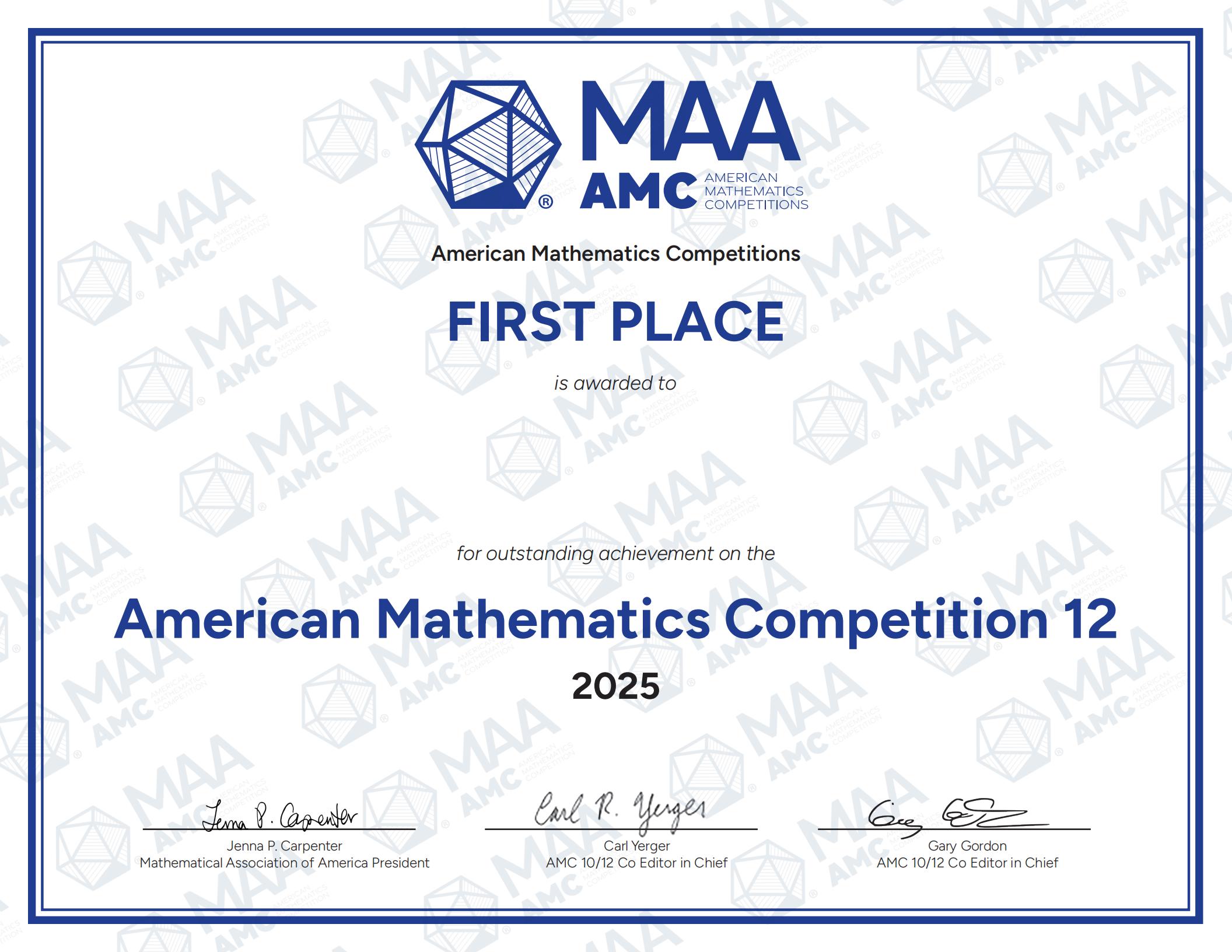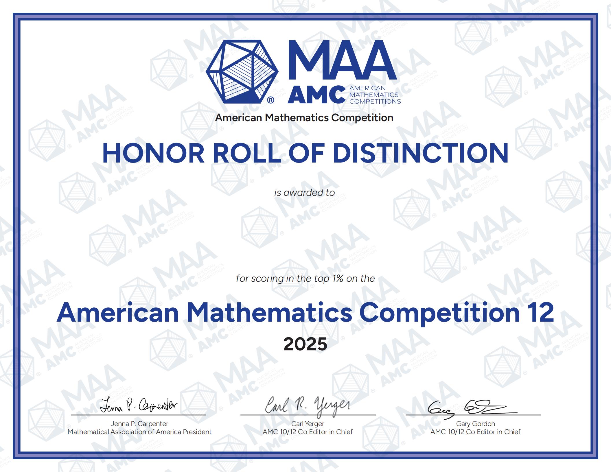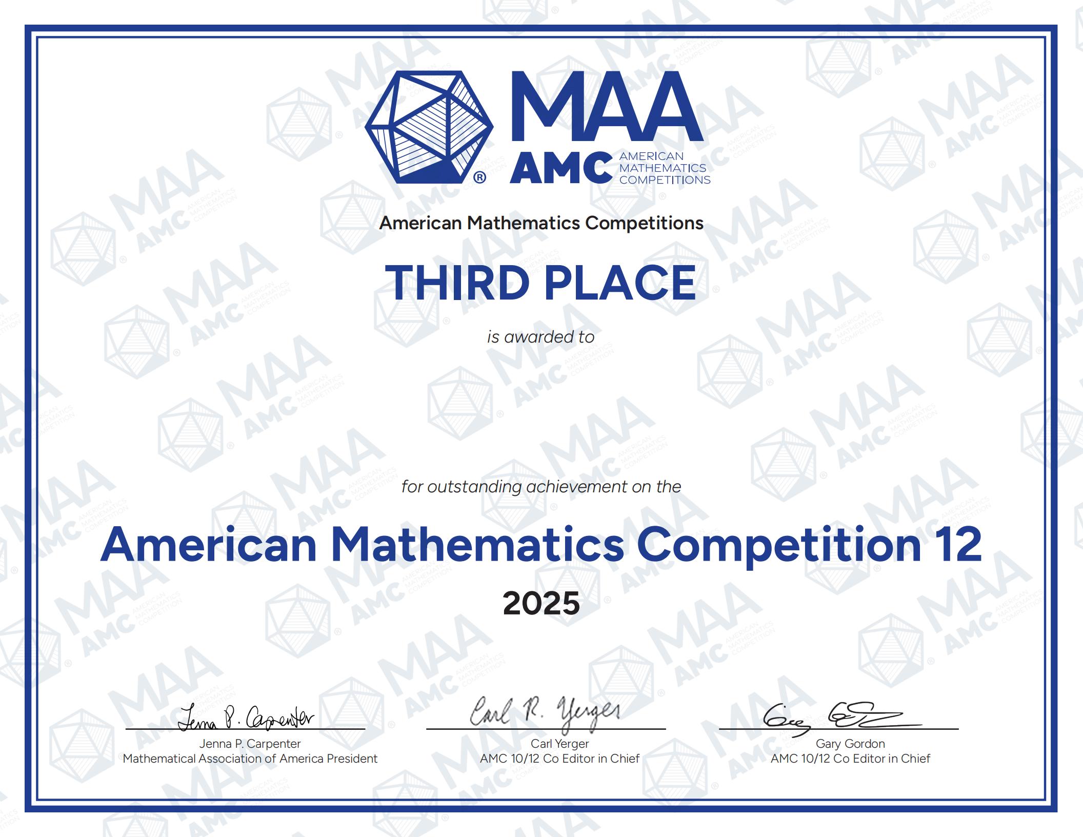 | Range | AMC 8 covers from a middle school mathematics curriculum. Possible topics include but are not limited to: counting and probability, estimation, proportional reasoning, elementary geometry including the Pythagorean Theorem, spatial visualization, everyday applications, and reading and interpreting graphs and tables. Some of the later questions may involve linear or quadratic functions and equations, coordinate geometry, and other topics traditionally covered in a beginning algebra course. | Usually covers mathematics syllabus in Grade 9 and Grade 10, including elementary algebra, basic geometry (Pythagorean theorem, area and volume formulas, etc.), elementary number theory and probability. Trigonometry, advanced algebra and advanced geometry will not be included. | AMC12 covers all mathematics knowledge learned in high school, including trigonometry, advanced algebra, advanced algebra and part of calculus. | Students who get great results in AMC 10/12 will be invited to participate in AIME. More difficult than AMC 10/12. |