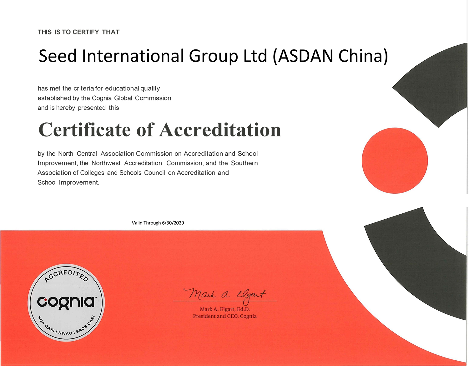 • 阿思丹(ASEEDER)成功通过国际教育权威认证机构Cognia(原AdvancED)官方认证,在围绕学习文化、领导力、学习参与度、学习成长4大维度的30项标准中获得高分,于2023年获得《Cognia国际教育认证》,是“亚洲地区唯一(非学校)机构获得Cognia国际教育认证”。