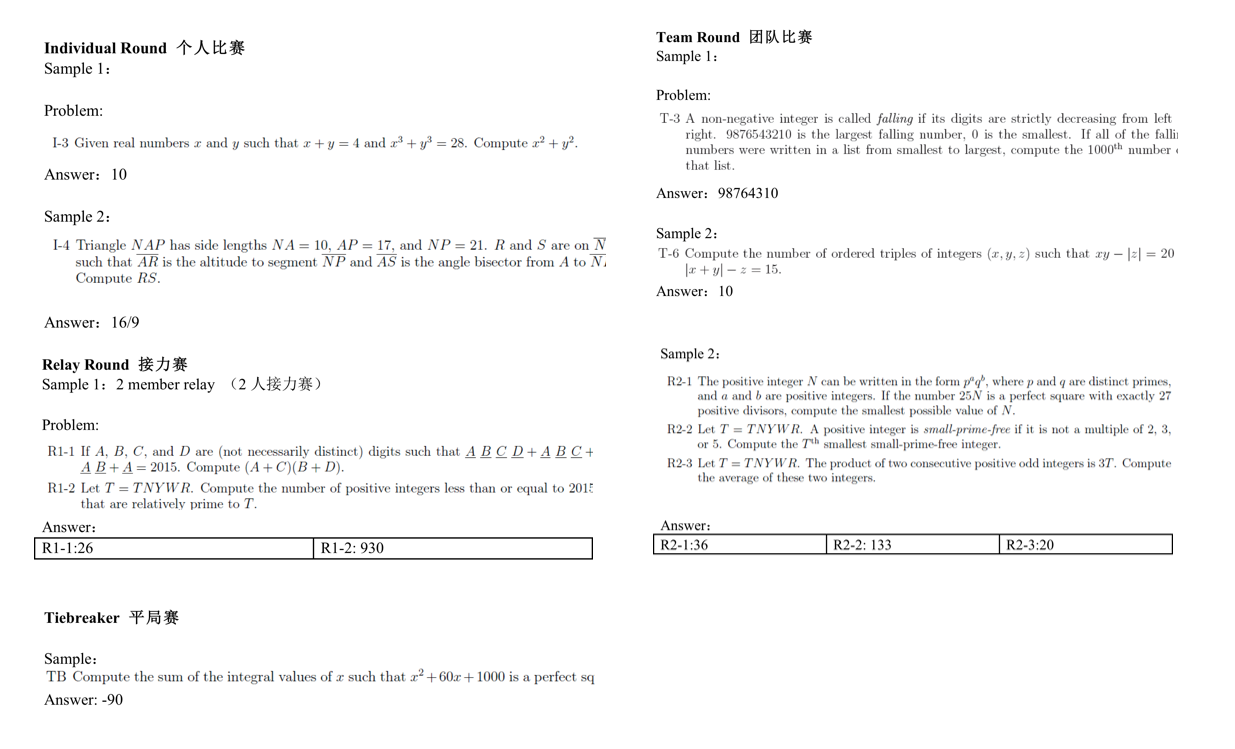 | 侧重点 | 注重提高团队协作和问题解决,让同学们在多样化的数学挑战形式中培养对数学的兴趣,用数学解决问题能力和团队协作能力。 | 注重个人数学能力,通过解决具有刺激并富于挑战的问题,提高学生在数学方面的兴趣及能力 |