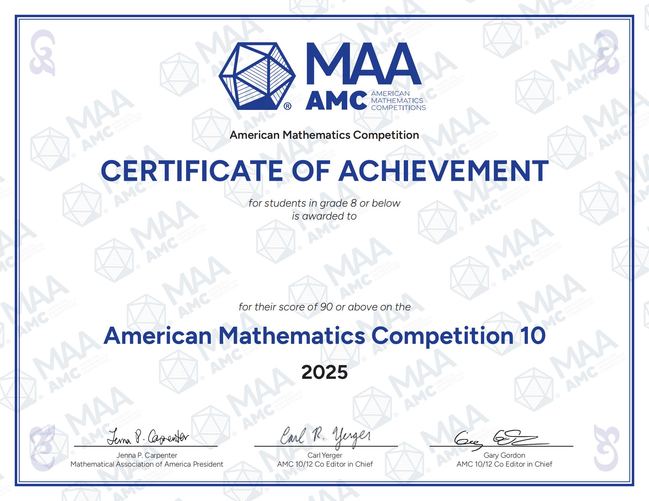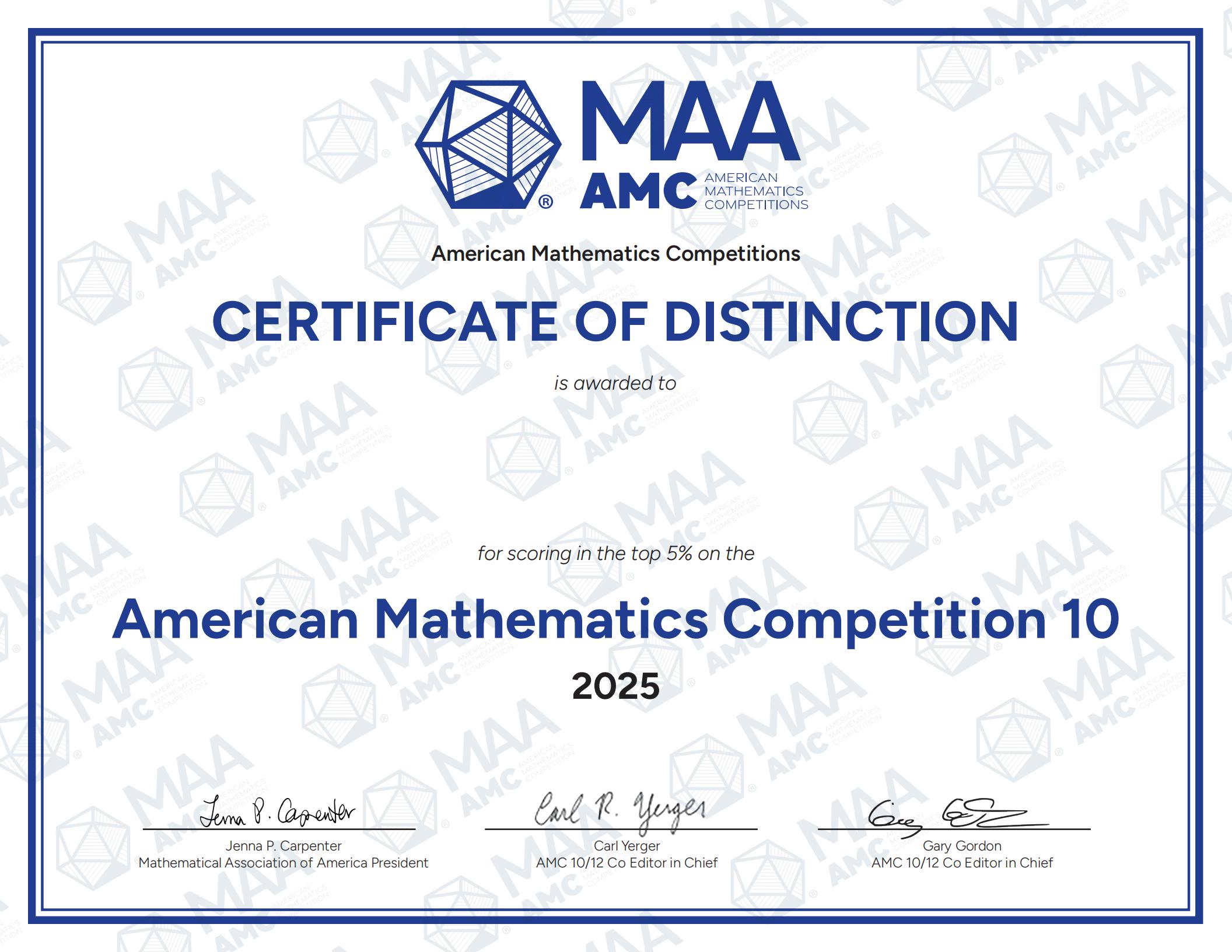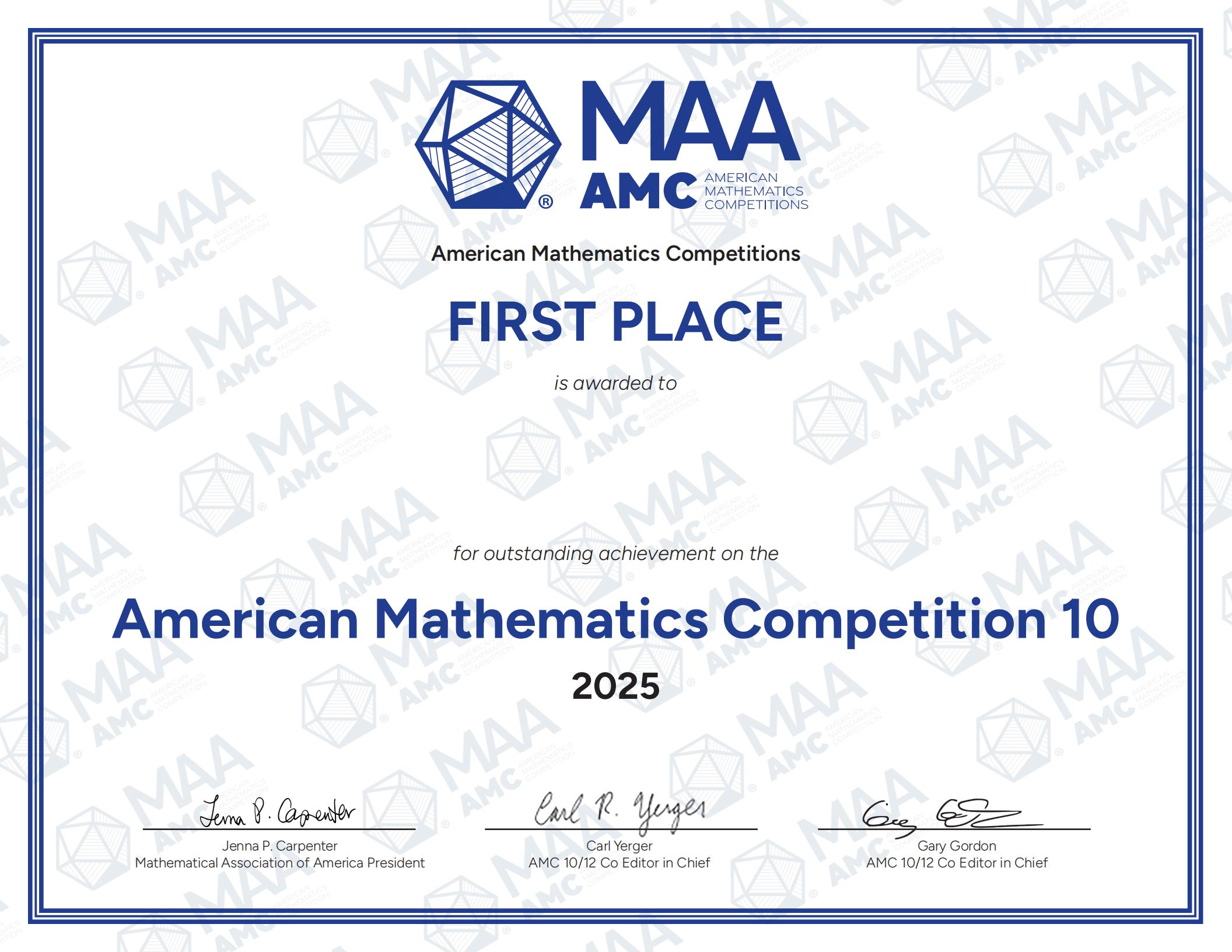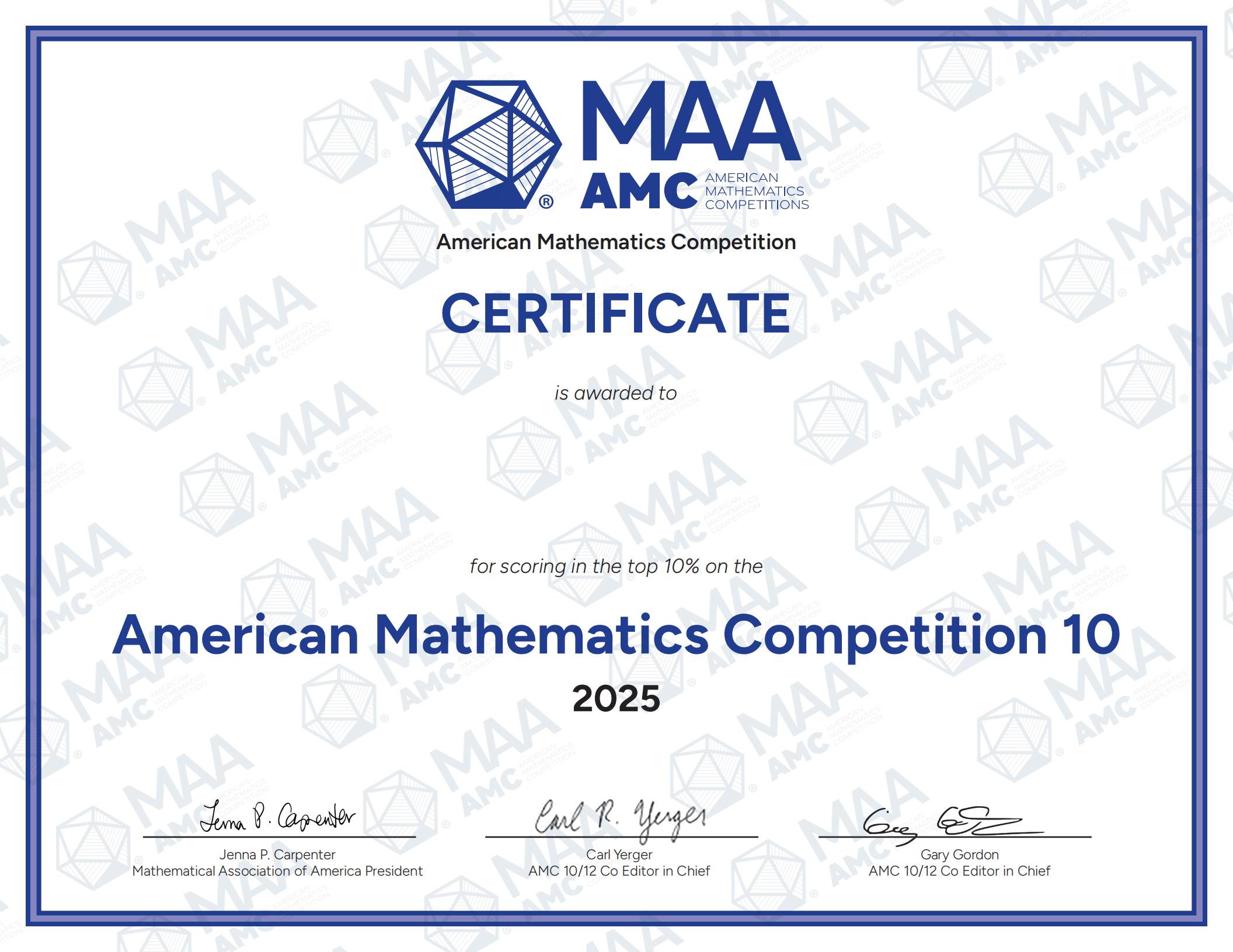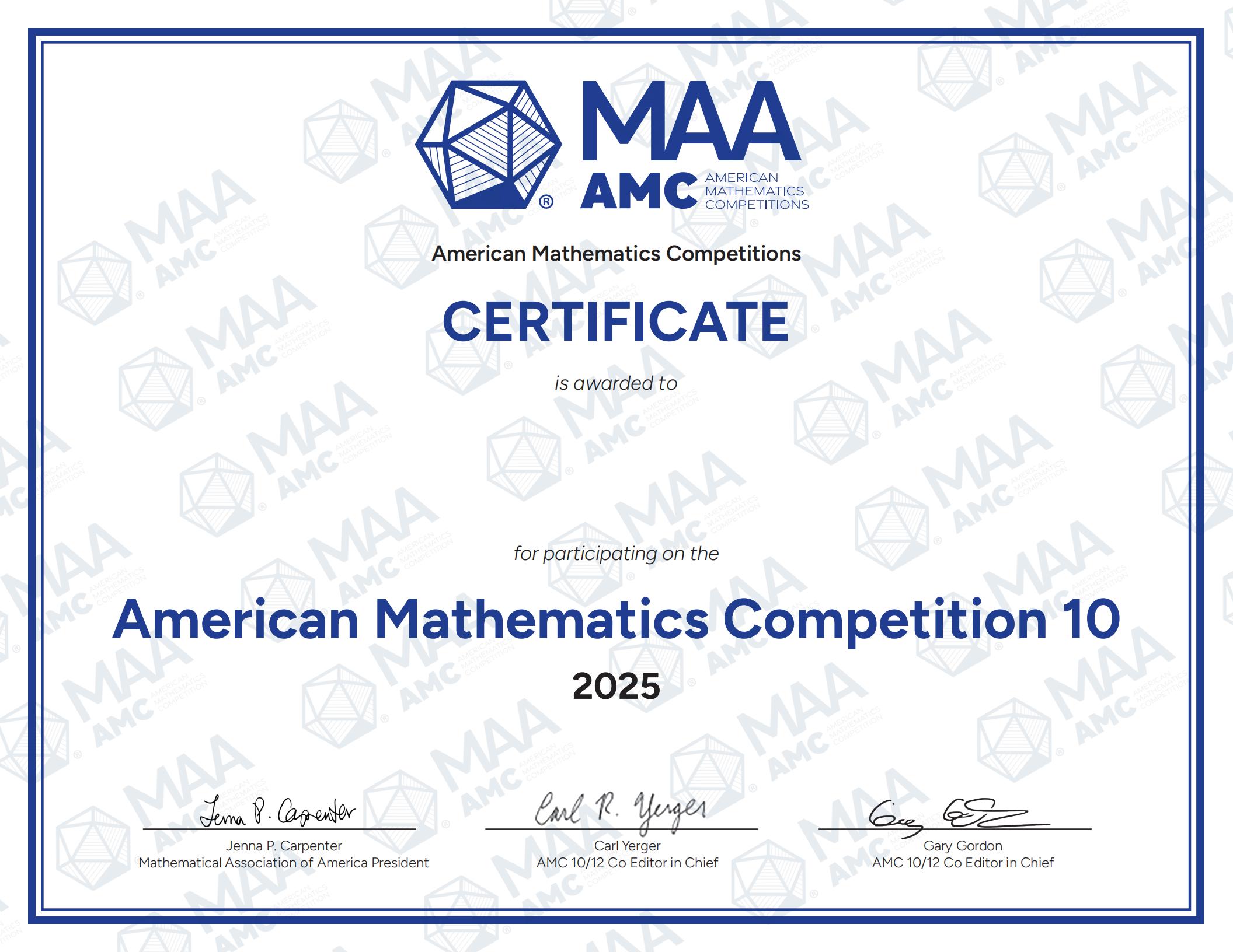 AMC10 Award and Display of Certificate