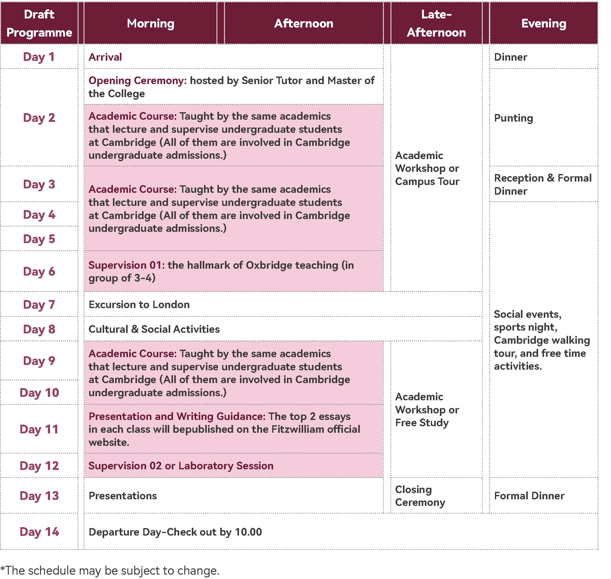 | Day9 | Academic Course: taught by Cambridge Tutors (about 50% of them have Oxbridge interview experience) | Academic Workshop or Free Study