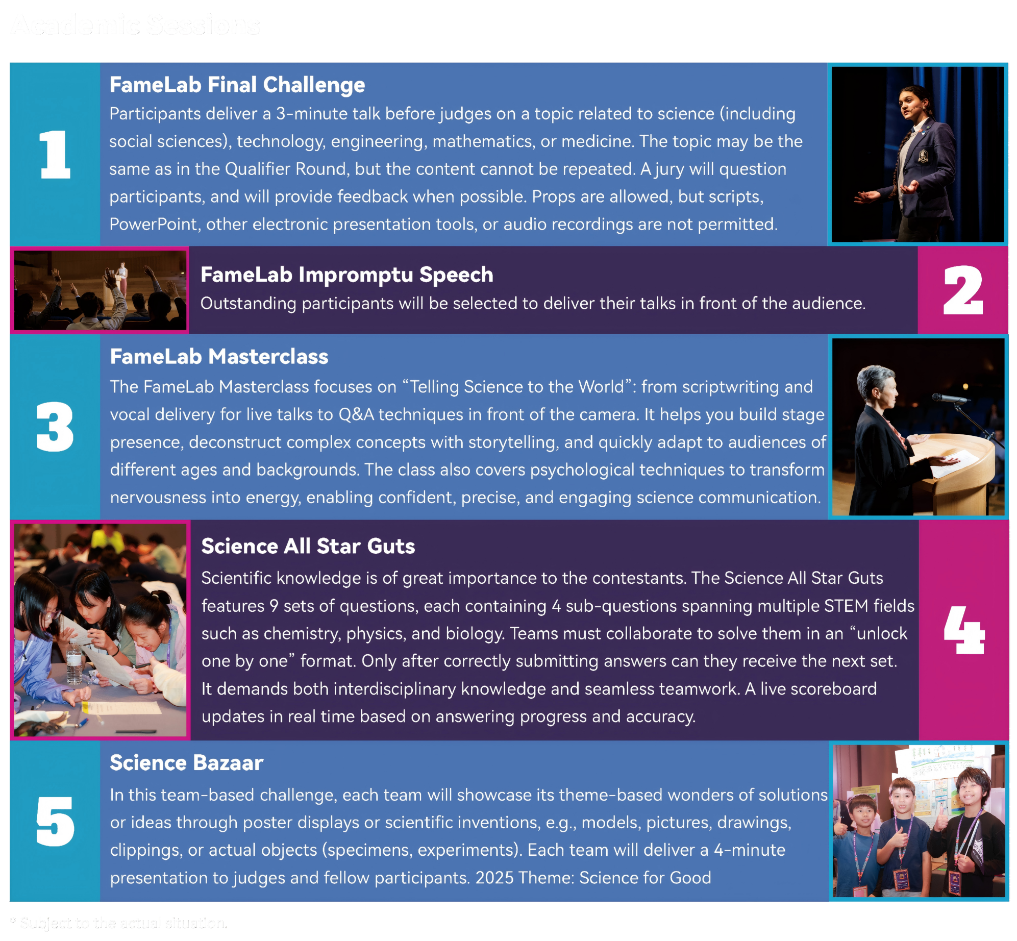 Participants are required to deliver a lively three-minute presentation in either English or Chinese on a science topic of their choice. They will be judged on the 3 Cs of FameLab – Content, Clarity, and Charisma.