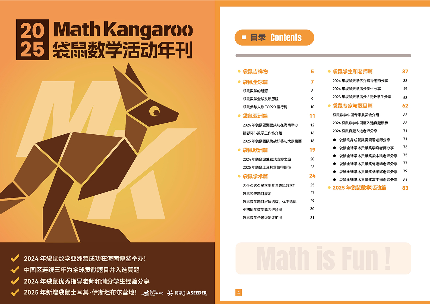 Since 2019, ASEEDER has been collaborating with the Math Kangaroo Global Organizing Committee to introduce Math Kangaroo to China. Math Kangaroo is one of the world's largest mathematics activity for young minds, engaging over 6.5 million students from 109 countries in 2025. Unlike traditional mathematics assessments that emphasize high difficulty and challenges, Math Kangaroo aims to stimulate children's interest and confidence in learning mathematics through engaging and life-relevant problems. It cultivates students' mathematical thinking and enhances their skills in reading, comprehension, analysis, and problem-solving, making it suitable for students of all grades and mathematical proficiency levels.