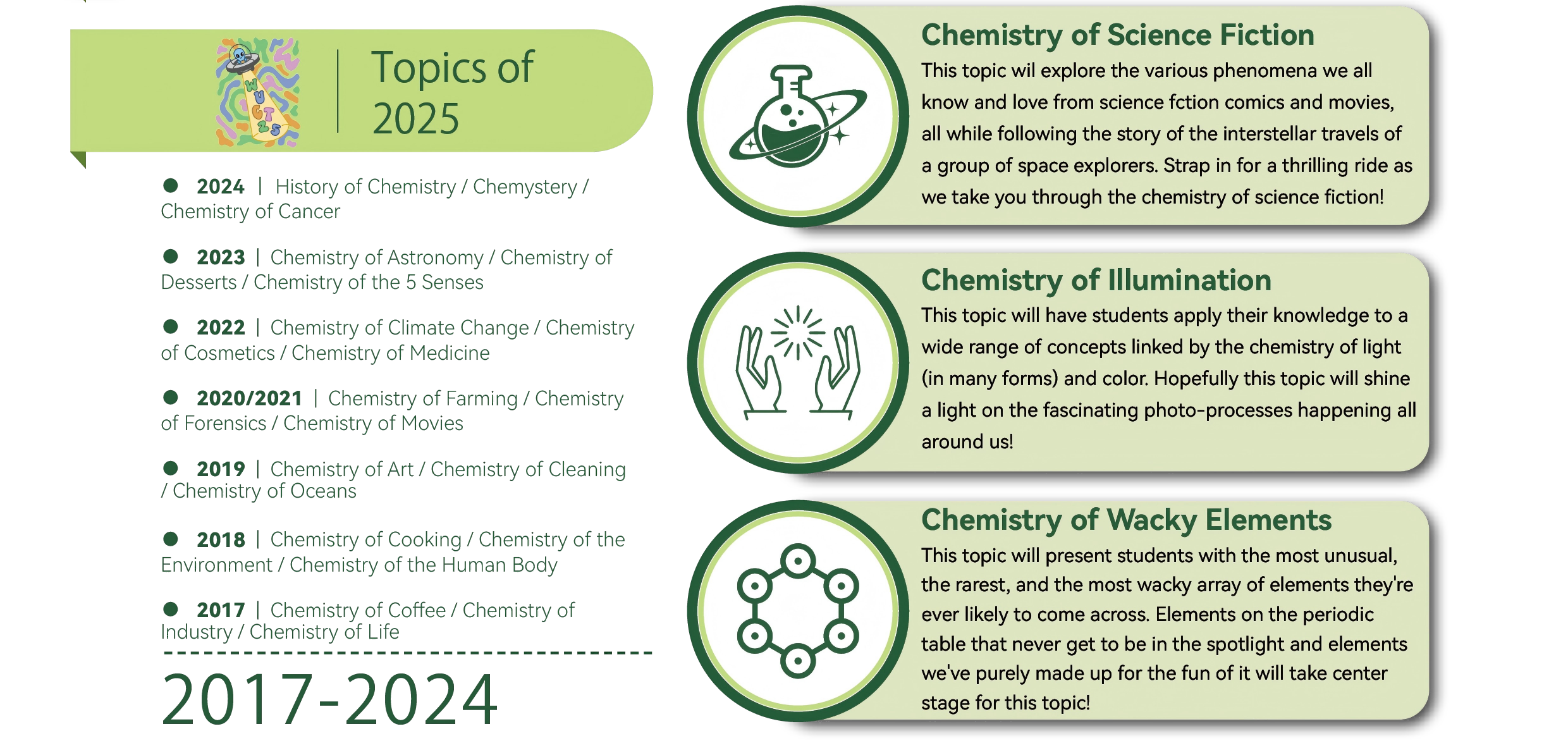 WUCT emphasizes real-world applications of science and encourages problem-solving and teamwork skills, making it a rare group activity in the field of chemistry. The challenge consists of four segments: an individual round, a topic round, a team round, and a relay-style (“Breaking Bonds”) round. WUCT aims to help students discover their ability to apply chemical knowledge and solve problems, focusing on real-world scenarios and advanced applications of chemistry. Students engage in diverse and cutting-edge challenge topics to enhance their understanding of chemistry, foster teamwork, and uncover their unique potential. Each year, WUCT announces topics, and the challenges and segments are designed around the topics, allowing students to not only participate in the challenges but also explore further into the forefront of chemistry.