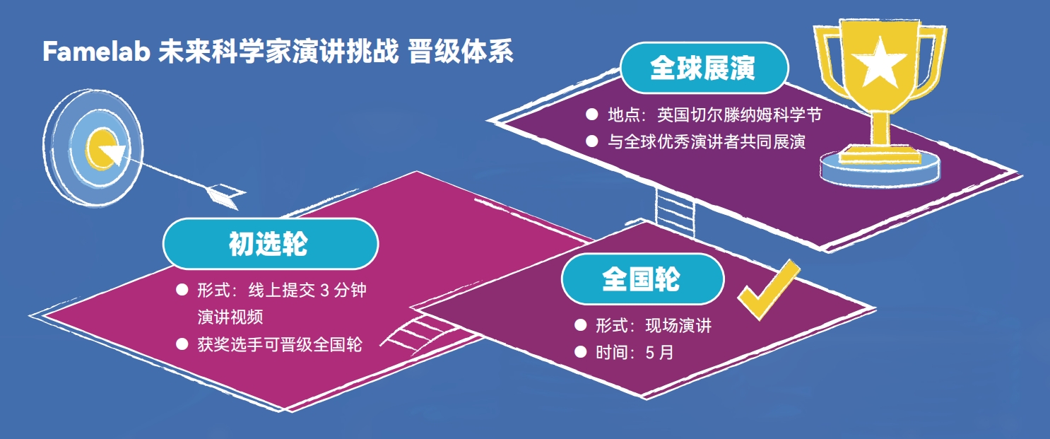 初选优胜者将晋级全国轮,与来自全国的优秀选手同台竞技,并有机会代表中国前往英国,参加切尔滕纳姆科学节 (Cheltenham Science Festival),与全球 FameLab Future Scientists 一同登台展演与交流,成为全球 FameLab 社区中最年轻的中国声音。